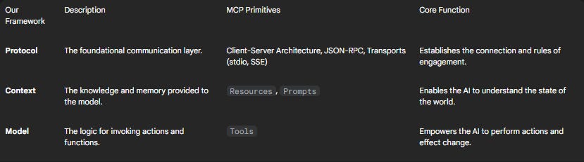 The table below provides a legend for how this conceptual framework aligns with the technical components of MCP, a structure that will guide this entire report.