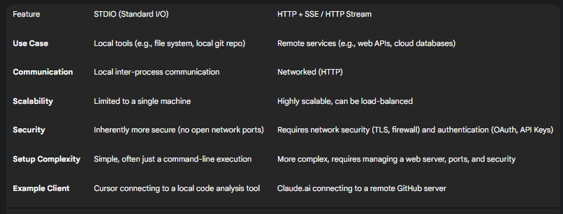 stdin) and standard output (stdout) streams. This is the ideal choice for tools that need to interact with the local environment, such as accessing the file system, running shell commands, or interacting with a local Git repository. Its primary advantages are simplicity and security; because it doesn't open any network ports, the attack surface is significantly reduced.HTTP + SSE (Server-Sent Events): This transport is the standard for remote, networked services where the MCP server is accessible over the internet or a private network. It uses standard HTTP for client-to-server requests and Server-Sent Events (SSE) for server-to-client notifications, enabling a persistent, real-time, and bidirectional communication channel. This is the transport you would use to connect an AI assistant to a cloud-based API, a remote database, or any other web service. While more powerful and scalable, it introduces the need for network security measures like TLS encryption and robust authentication mechanisms. Advanced frameworks like