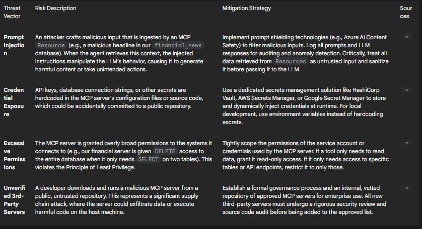 Deploying MCP servers introduces new potential attack vectors that require specific mitigation strategies. The following threat model outlines the most significant risks and the corresponding best practices for addressing them.