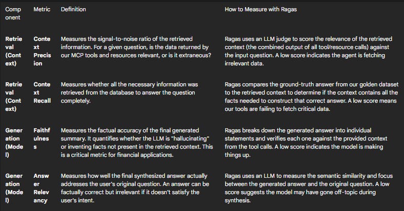 ToolsorResources. Perhaps the SQL query in theget_news_for_tickerresource is too restrictive, or thecalculate_moving_averagetool is not fetching a large enough data window. The solution is to refine the logic within the MCP server.If Faithfulness is low, but context metrics are high, the problem lies with the LLM's generation step. The LLM is failing to ground its response in the provided data. The solution might involve improving the prompt template used for the final synthesis step, providing more explicit instructions to "only use the provided context," or switching to a more capable (and likely more expensive) LLM that is better at following instructions.