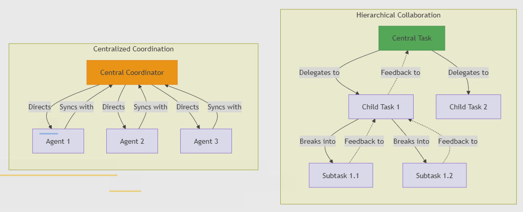 Collaboration Loops: Added dotted feedback arrows to show iterative refinement (e.g., subtasks reporting back up the hierarchy).