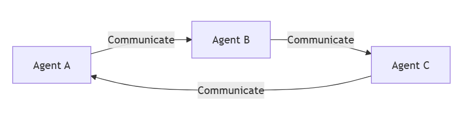 In this diagram, each agent can communicate directly with others, forming a flexible network. This peer-to-peer interaction allows agents to decide their communication pathways based on task requirements.